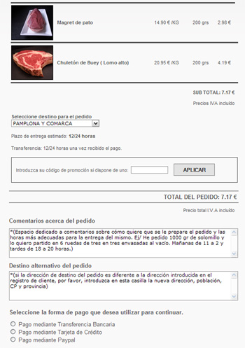 Seleccionaremos de la lista desplegable la zona a la cual debe enviarse el pedido en curso. En caso de seleccionar PAMPLONA Y COMARCA los costes de transporte son gratuitos, en el resto de los casos, cada zona conlleva unos gastos de transporte que se añadirán de forma automática al importe del pedido.