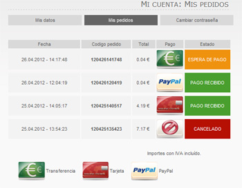 Una vez realizado el pago mediante cualquiera de las dos opciones ofrecidas ( transferencia o tarjeta ) puedes ver tus pedidos realizados y el estado de cada uno accediendo a la ficha de cliente mediante el menú "Mi cuenta" y "Mis pedidos".